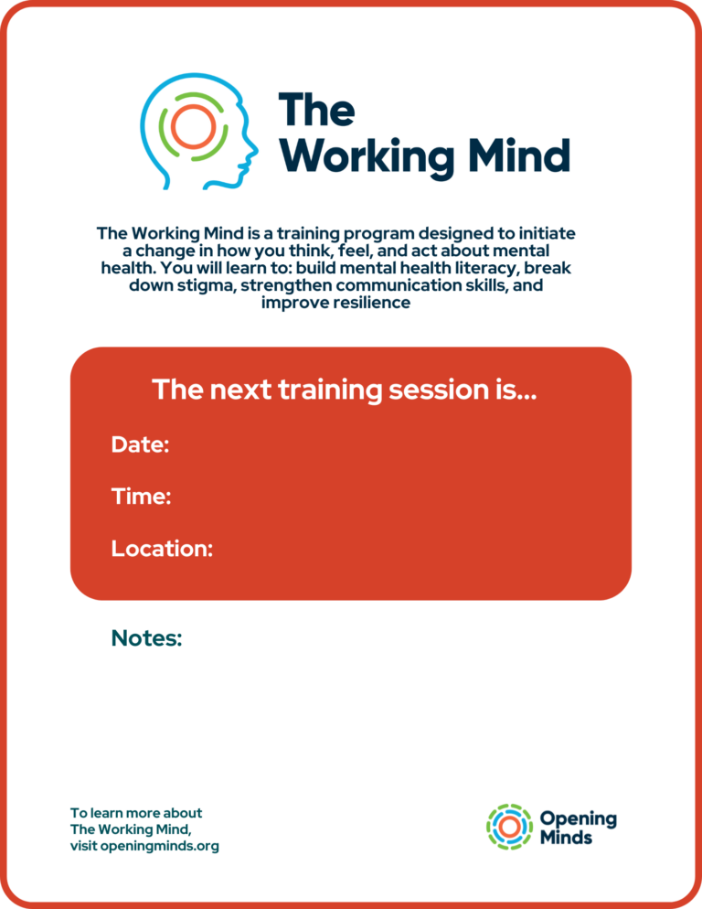 The Working Mind Contact Fillable poster is used to inform potential students on the place and time of the next...